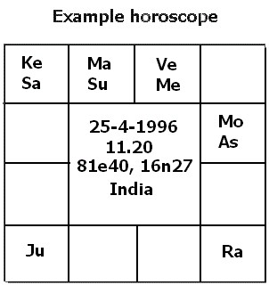 In the example horoscope, Ascendant lord Moon is posited in the Ascendant and hence it is stronger than the 7th house. Hence, dasa periods will start from Cancer onwards as: Cancer, Leo, Virgo, Libra, Scorpio, Sagittarius, Capricorn, Aquarius, Pisces, Aries, Taurus, Gemini.